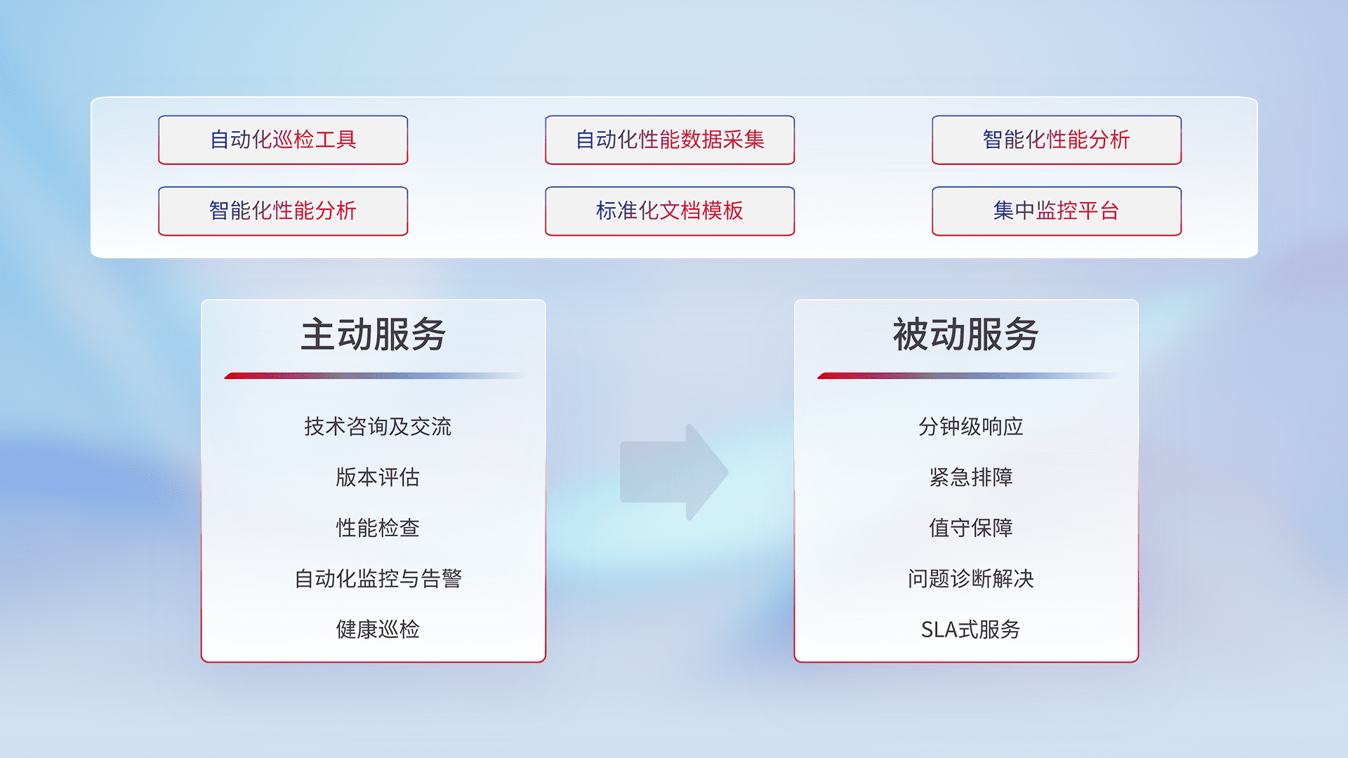 智能化工具和标准化文档,,,,保障服务质量,,,,提供主动服务(包含技术咨询、、版本评估、、性能检查、、自动化监控与告警、、、、健康巡检)和被动服务包含(分钟级响应、、、紧急排障、、值守保障、、问题诊断解决、、、、SLA服务)。。。